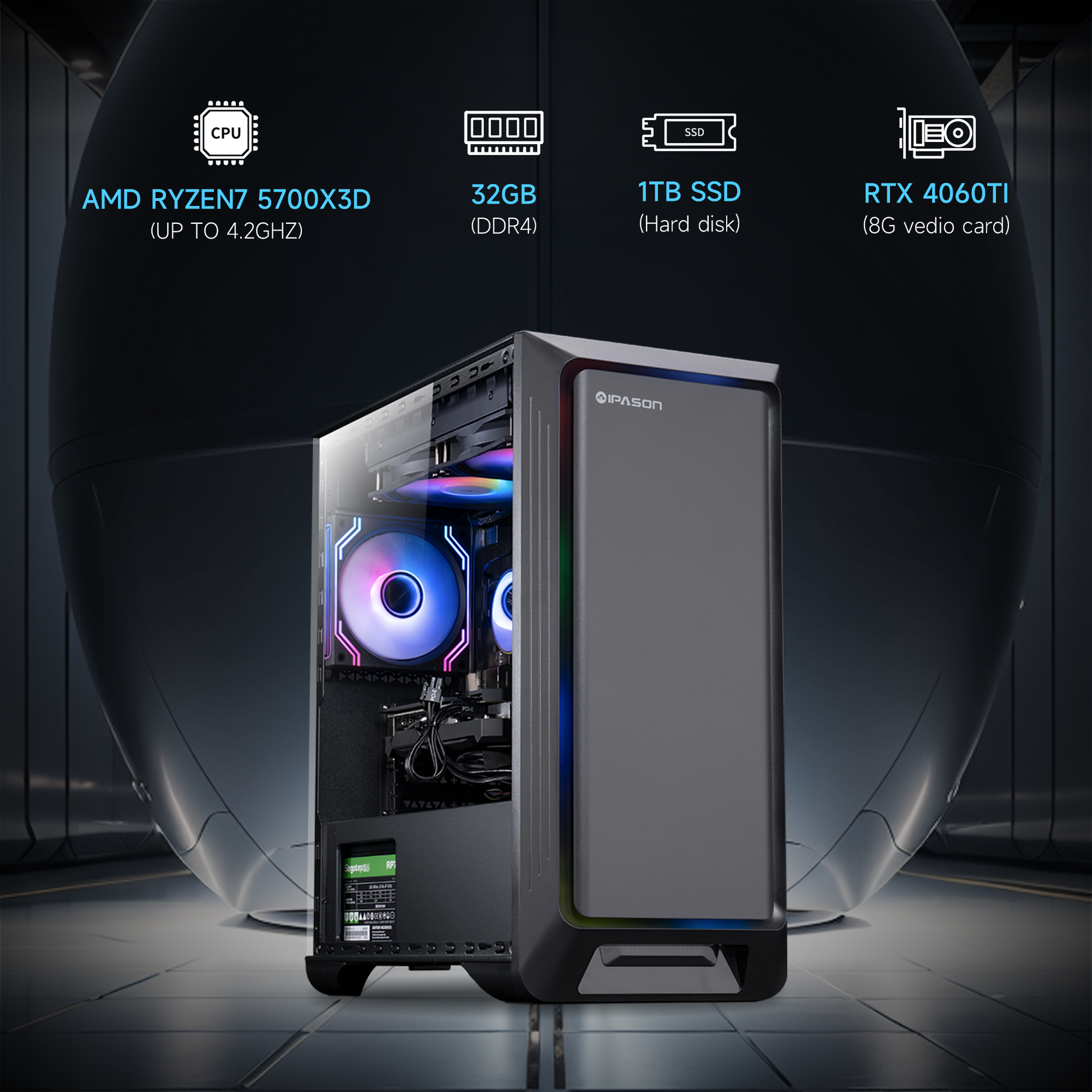 Ipason IPASON FireDragon G1 Max AMD Ryzen 7 5700X3D 8x Cores 16x Threads up to 4.10 GHz Colorful GeForce RTX 4060TI DUO 8G V2 DDR4 32G 3200MHz (2 x 16GB) Kingston Nvme 1T M.2 SSD Windows 11 Home